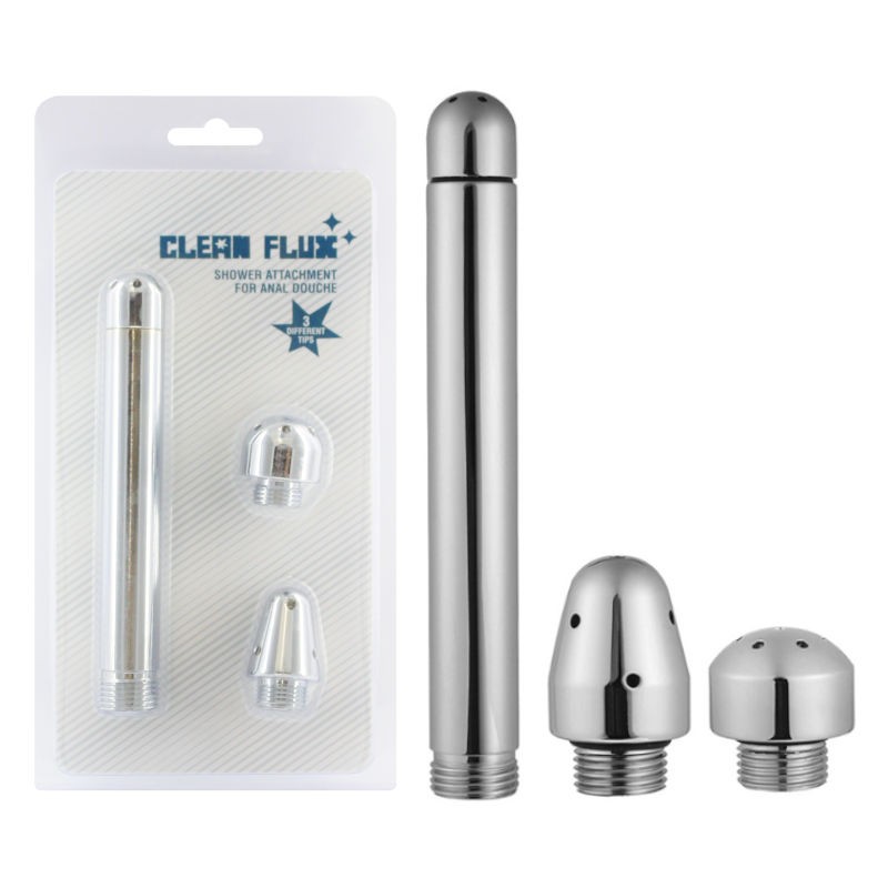 O Clean Flux é um acessório em aço inoxidável para colocar diretamente na mangueira do chuveiro. Indicado para duche anal e/ou para maravilhosas sessões de masturbação no duche. Inclui 3 cabeças diferentes.a
